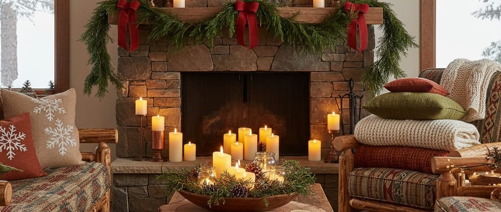 Lay a strip of burlap or linen across your dining table, then tuck fresh pine or holly sprigs along the edges. Add unscented candles for a cozy, farmhouse-style dinner setting.